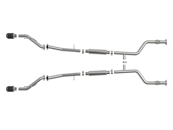 This cat-back exhaust system is constructed of 2-1/2 IN mandrel-bent brushed finished 304 stainless steel tubing for maximum strength and durability. Finishing off this exhaust system are dual 4-1/2 IN diameter carbon fiber stainless steel clamp-on exhaust tips. The tips feature an aFe POWER logo for a unique style. This system produces an aggressive sound unleashing all available horsepower and torque. Utilizing factory style flanges and hangers this system is a direct bolt-on system, which requires no cutting or modifications for a hassle-free installation. This cat-back exhaust system uses a heavy duty flex pipe with an internal interlock liner for added strength and durability. This system features a crossover balance tube designed to equalize and distribute exhaust pulses reducing drone, and improving sound. State-of-the-art computer-aided design technology is utilized for precise vehicle fitment. 100% TIG-Welded for race-proven strength and durability.