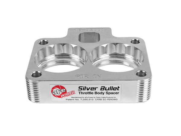 Silver Bullet throttle body spacers create turbulence in the air flow at the point just prior entry into the engine increasing horsepower, torque and improving throttle response and fuel efficiency. Silver Bullet throttle body spacers are constructed out of durable T-6061 billet aluminum and using a unique serrated/helix entry to create turbulence at the manifold while eliminating the annoying whistle found in other helix only throttle spacers.