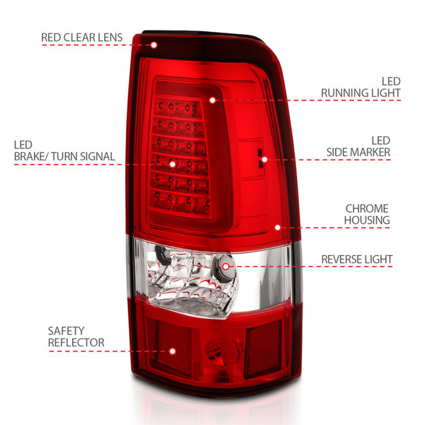 Tail Light Assembly, LED: Red/Clear Lens, Chrome Housing, Pair, Plank Style Design. Guaranteed To Improve Your Vehicles Appearance. Rigorously Tested For Fit And Function. Increased Illumination. Easy Installation Using Common Hand Tools. Sold As A Pair. D.O.T. Compliant To S.A.E. Standards.