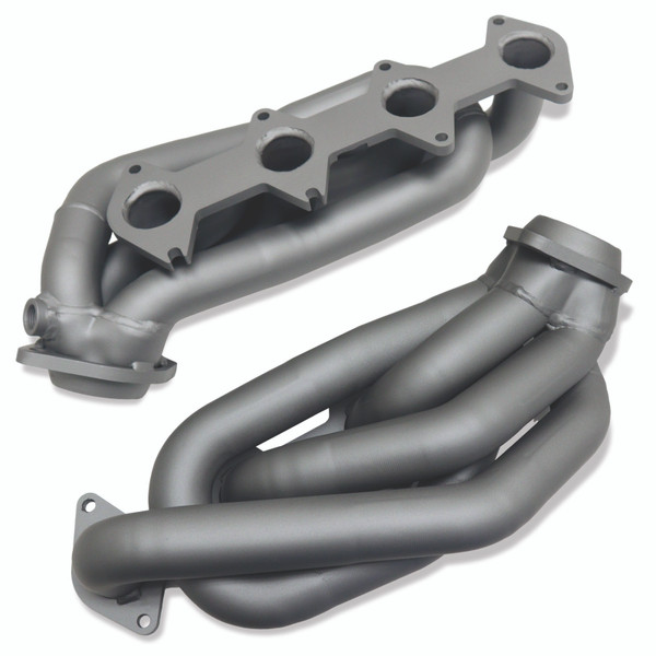 These BBK Performance shorty tuned Length exhaust Headers are designed and constructed as direct fit replacements for all 2005-10 Mustang GT applications. Each header is manufactured with 1-5/8 in. CNC mandrel bent tubing that offers unrestricted exhaust flow for increased horsepower and torque over factory OEM manifolds. BBK tuned Length headers offer improved scavenging waves for better combustion, which leads to improved performance and fuel economy over stock or equal Length headers. As with all BBK Performance exhaust headers they feature a 3/8 in. laser cut flange for additional strength and a guaranteed leak free fit. All headers are robotically and precision hand welded and then pressure tested to ensure years of reliability and performance in the real world. All BBK exhaust headers are available in a high temp titanium ceramic or polished silver ceramic coated finish and include new exhaust header gaskets, header bolts and hardware to complete the installation.