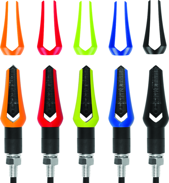 BikeMaster® Dagger Turn Signals are constructed from a durable plastic housing, two Amber LEDs and covered with a smoke lens. Ultrasonic welded, with a short stem and an 8mm mount bolt. Includes black, blue, red, green and orange covers that can be interchanged for a customized look.