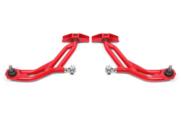 A-arms are one of the most important, yet overlooked suspension components. They are the direct link between the front wheels and the chassis. Any deflection causes a change in alignment, which results in poor performance and driving feel. Fabricated from heavy-duty 1.25-inch, 0.120-inch wall DOM tubing, deflection is eliminated with A-arms from BMR Suspension. BMRs AA755 Lower A-arms are equipped with greasable heavy-duty ball joints, greasable Delrin bushings (rear mount) to handle the high loads, and zinc-plated, X-series, heat-treated, chrome-moly, self-lubricating, Teflon-lined rod ends for loads of adjustability. Solid mounts give you a more responsive feel over the stock rubber bushings. BMRs bushings allow grease to evenly coat the inner sleeve. This efficient lubrication ensures quiet, reliable operation over the life of the bushings. The combination of rod ends and Delrin bushings gives you improved steering feel and responsiveness for any for of driving. BMRs AA755 lower A-arms eliminate A-arm deflection, greatly improving steering feel and response in normal and performance driving situations. The rod ends and Delrin bushings add strength and reduce deflection over the stock rubber bushing. The means you get great performance. Designed for street performance, drag race, and handling, and pro-touring applications, BMR lower A-arms are engineered to give you improved geometry and increased lateral grip during cornering situations. BMR Suspension AA755 Adjustable Lower A-arms are available in black hammertone and red powdercoat for long-lasting good looks. Installation time is 3-4 hours. Proudly made in the U.S.A. Control arm hardware kit RH014 (Includes upper and lower control arm hardware - Highly Recommended) also available.