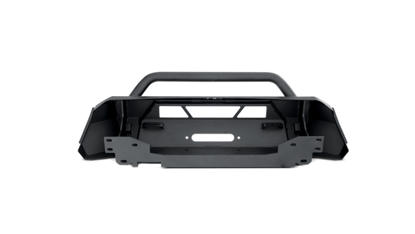 Introducing our high clearance bumper, designed with a sleek low-profile to enhance your vehicle's approach and departure angles. This bumper features a welded bull bar for added protection and a 10,000lbs winch capacity, compatible with WARN ZEON winches, ensuring you have the power needed for recovery operations. Integrated shackle recovery points provide additional functionality, while the light fitment accommodates a 20" dual row LED for superior visibility. It seamlessly fits the factory TRD skid plate and offers direct bolt-on installation with no drilling required, although trimming of the factory bumper is necessary. The bumper includes a license plate bracket and is finished with a durable two-stage light texture black powder coat, backed by a 3-year finish warranty and a limited lifetime warranty. Perfect for off-road enthusiasts, this bumper combines strength, style, and practicality for all your adventures.