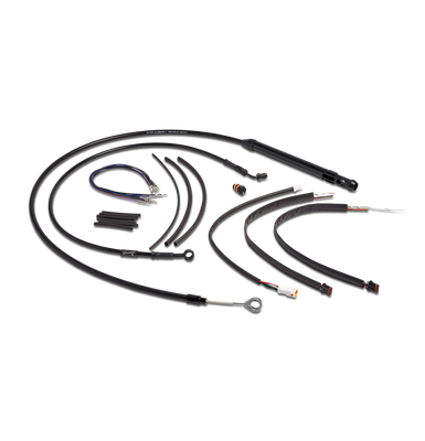 Complete cable/line installation kit for Burly Ape hangers. Kit includes extended brake line, extended clutch cable/clutch line, extended throttle/idle cables as required and all necessary wiring extensions. Brake lines feature PTFE inner liner and heavy-duty stainless steel outer braid. Dresser kits reuse stock Throttle-By-Wire harness. Made in the U.S.A. Included Items: (1) Black vinyl clutch cable measures 41-1/2 in. W/ 3/4 in. travel, (1) 38-1/2 in. Black vinyl brake line W/(1) 3/8 in.-10mm20 degree banjo fitting & (1) 3/8 in.-24 inverted flare, (1 Banjo bolt, (2) 3/8 in./10mm Copper crush washers, (1) Main harness extension kit, (1) Fly-by-wire extension kit, (6) Colored wires, (2) 12 in. Shrink tubes, (6) 2-1/2 in. Shrink tubes, Instructions.