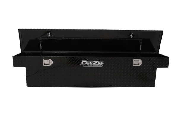 Dee Zee Tool Box - Specially Narrow Crossover box. Constructed of durable Brite-Tread aluminum with narrow design for subtle look. Black-Tread powder coat, provides a gloss black finish while it protects and prevents oxidation. Other features: lockable push-button handles, dampened gas shocks, closed cell foam gasket, and self-adjusting strikers. J-Bolt mounting hardware included. Ideal for todays short bed crew cab or any truck that doesnt want to lose valuable bed space.