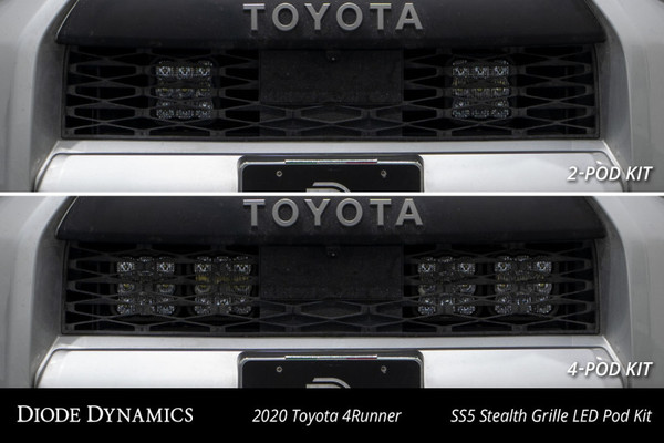Features Bolt-on fitment compatible with Toyota 4Runner 2014-2024. Allows you to mount two to four SS5 pods behind the grille. Ultra-high intensity, with custom-engineered TIR optics. Selectable backlight color, with eight color options. Torture-tested, heavy-duty construction. SS5 Pods are assembled in the USA.   Overview Perfect Fitment. The SS5 Stealth Grille LED Pod Kit compatible with Toyota 4Runner 2014-2024 from Diode Dynamics allows you to mount two to four Stage Series 5-inch LED pods behind the factory grille without interfering with the Safety Sense feature! These application-specific brackets were CAD-designed to bolt on using factory mounting points on the factory bumper. No cutting or drilling required! Mounting Options. This kit is available in a two or four-pod configuration which will not interfere with the Safety Sense feature. If your vehicle does not come equipped with Safety Sense feature, you can mount an additional fifth SS5 LED Pod Light on the center of the crossbar for even greater output! Designed for Performance. Featuring the highest output intensity of any 5-inch LED pod on the market, these auxiliary lamps have been designed for maximum functionality, with patented technology and custom-engineered TIR optics. The brackets included with this kit are made of durable powder-coated steel and have been precision tested to ensure your SS5 Pods will not vibrate while you're off-road. Selectable Backlight. The Stage Series 5-inch LED Pods included in the White kit feature a selectable backlight with eight different color options, perfect for an extra styling accent that you won't find on other LED pods. NOTE: The Yellow kit is only available with an Amber backlight color.