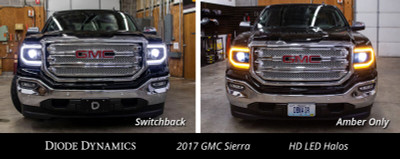 Features Computer-designed LED boards compatible with GMC Sierra 2014-2015 headlights. Two high power LEDs in place of each original white chip. A huge increase in brightness, even in direct sunlight. Adds brighter running light, and amber turn signal. Engineered and assembled in USA. Overview Time for an upgrade! This kit is compatible with GMC Sierra, which has LED accents in the headlights from the factory that illuminate in a white color, for the parking light and DRL. Diode Dynamics replacement LED boards add a brighter DRL and additional amber turn signal for a custom, yet functional look. Your order includes two sets of LED boards, one for each side of the vehicle. Switchback. These LED boards are a direct replacement for the factory ones, but have double the number of LEDs. They illuminate white for your parking lights and DRLs, with a dimmed power level at night. Anytime you hit your turn signal, they light up in a brilliant amber that is even brighter to indicate signaling. While the amber is extremely bright, we do not recommend disabling your factory turn signal. OEM-grade design. At Diode Dynamics, we work directly from OEM data, and use a 3D scanner, to develop precise replacement boards with identical mounting points and shape. Just remove the original boards, and ours will fit directly in place with correct alignment. You'll also see OEM design features, such as high-intensity automotive emitters, wire connectors, and serial numbers for quality assurance. What’s Included: Two (2) sets of LED boards, left and right Two (2) waterproof drivers Two (2) input wire pigtails with T-taps