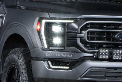 Features Dual Bi-LED projectors for maximum output and intensity Selectable color, premium Blade DRL Modern welcome sequence and sequential turn signal Optional adaptive Low Beam Assist and High Beam Boost Integrated off-road lighting and show mode (Elite Max) Engineered and Assembled in USA - 8 Year Warranty Overview Introducing Elite Series LED Headlights compatible with 2021-2023 Ford F-150 w/ Non-Projector Headlamps from Diode Dynamics! These headlights were designed for maximum performance, and they are the only aftermarket headlights for the F-150 that are 100% engineered and assembled in the USA! With OEM-grade quality, the Elite Series headlights will add a sequential turn signal, welcome sequence, a brighter blade DRL with selectable color, and optional offroad lighting and show mode. Plus, you’ll get upgraded headlight performance and output, backed by an 8-year warranty. Maximum Light Output.The Elite Series LED Headlights provide full LED illumination for both low beam and high beam function, with the modern, rectangular bi-LED projector. This unit provides higher intensity than both the OEM halogen and LED options, shining light far down the road ahead. The beam pattern has a sharp cutoff, with excellent center intensity and strong width, for a fantastic nighttime driving experience. The same projector is installed on both the Elite and Elite Max models. Selectable DRL - On the Fly. These headlights feature a selectable DRL, to customize the look of your F-150. With up to four distinct DRL modes, you can choose white and amber colors, and enable or disable the extra DRL bars (if equipped). No need to pop the hood. Our patent-pending technology allows you to program your headlights from inside the vehicle, using existing controls.