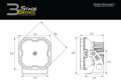 Features Modern TIR optics provide highest intensity on the market Backlight accent feature, in a brilliant amber color Durable powdercoated aluminum construction Integrated Deutsch-style connector Engineered and Assembled in USA Overview Introducing the SS3 3 inch LED Pod! Featuring higher output intensity than any other 3 inch light on the market, these LED pods have been designed for maximum functionality, with custom-engineered TIR optics shining in highly useful beam patterns, all in a durable package. All Stage Series LED pods are available in a cool white or selective yellow color, and sport or pro power levels. Focused. Traditional optics like reflectors or simple lenses lose light internally and to glare, so not all of the light shines on target. Instead, the custom-engineered TIR optic in the SS3 collects all of the light from the LED, and directs it only where you need it, drastically reducing glare and improving total efficiency. The total intensity of the SS3 is much greater than other LED pods using basic optics or reflectors with a standard outer lens. Backlight Functionality. The Stage Series 3" LED Pod is now available with a distinctive backlight, in a brilliant amber color. The SS3's backlight fully illuminates the TIR optic, providing a more unique and modern look than the small indicator LEDs found in other products. Simple connections. All SS3 LED pods feature a custom-molded DT type Deutsch-style connector on the back, and come with a 6-inch pigtail with bare leads.