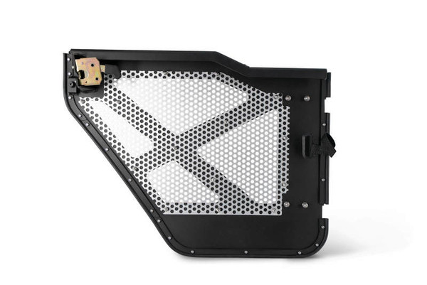 DV8 Offroad Jeep JL Half Doors (Rear). The DV8 Offroad Jeep JL half door was designed with function and customization in mind. All of the aluminum screens are removable and can be painted or left as they are. These doors feature anti-rattle gaskets all the way around them and a two stage locking mechanism for a secure fit. Features: Perforated Aluminum Mesh Screens, All Aluminum Doors To Cut Down Weight, DV8 Textured Powder Coat Mirrors Included, 2 Stage Locking Door Latches, Anti-rattle Rubber Gaskets