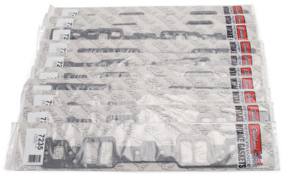 Edelbrock part #7215 Intake Gaskets for 1958-1986 E-Tec 200 Small-Block Chevy allow for optimum flow and performance. Any gasket can create a seal, but a good gasket can do it with less clamping force, and for a longer period of time. The new MP-2N Micropore technology does not use solvents making our gaskets environmentally friendly. Impervious to most chemicals, this synthetic fiber composite provides a high recovery under load. This means that when compressed, the gasket will conform to any imperfections on the sealing surface even using lower flange pressures. A nitrile bead around each port opening makes the seal even better.