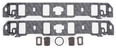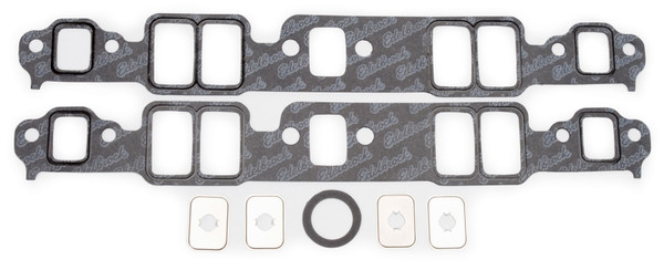 Edelbrock part #7201 Intake Gaskets for 1958-1986 Small-Block Chevy allow for optimum flow and performance. Any gasket can create a seal, but a good gasket can do it with less clamping force, and for a longer period of time. The new MP-2N Micropore technology does not use solvents making our gaskets environmentally friendly. Impervious to most chemicals, this synthetic fiber composite provides a high recovery under load. This means that when compressed, the gasket will conform to any imperfections on the sealing surface even using lower flange pressures. A nitrile bead around each port opening makes the seal even better.