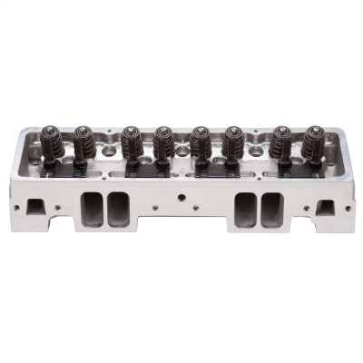 The Edelbrock part #77599 Small Block Chevy Victor Jr. 215cc cylinder head is an affordable version that will still allow for maximum power when used in competition and ultra high-performance's street applications. This cylinder head has the potential of 530-580 hp out-of-the-box, for a cost effective, race-winning set-up. These cylinder head features angled spark plug holes and accept standard 23deg valvetrain hardware. The 77599 cylinder head has a 64cc combustion chamber and come with springs for mechanical roller camshafts. The 64cc chambers yield about 12.5:1 compression with a 12cc domed piston in a 350 V8.