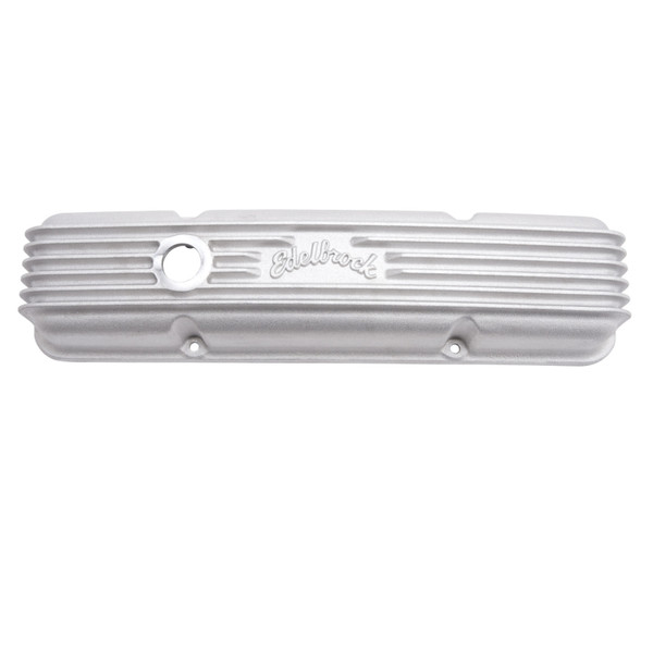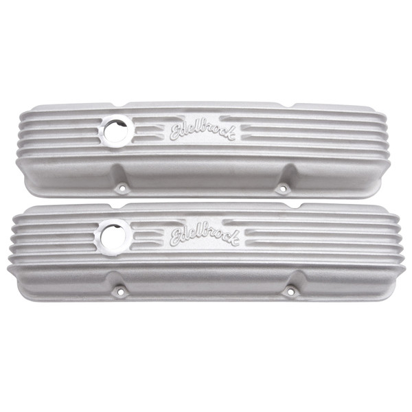 Edelbrock part #41439 Classic Series Valve Covers are designed for Chevy 262-400 V8 1959-86 (with breather holes) applications and have a Satin finish. Edelbrock first made these aluminum valve covers in the late '50s and they're still a classic. Made of heavy-gauge sand-cast aluminum, Overall height is measured from base to top at the highest point. Edelbrock classic valve covers can be machined to accept breathers if desired.