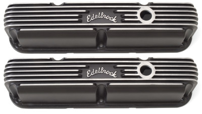 Edelbrock part #41923 Classic Series Valve Covers are designed for Chrysler Big-Block 383/440 applications and have a Black finish. Edelbrock first made these aluminum valve covers in the late '50s and they're still a classic. Made of heavy-gauge sand-cast aluminum, Overall height is measured from base to top at the highest point. Edelbrock classic valve covers can be machined to accept breathers if desired.