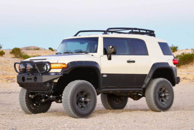 Fabtech's FJ system features extended length steering knuckles attaching to one piece lower control arm crossmembers for a full 6 inches of lift to clear 35'' tires. Front lower crossmembers feature adjustable alignment cams along with an integrated 1/4'' thick steel differential skid plate. The Basic system retains the front strut assembly for a smooth highway ride with ease of installation. The Basic rear suspension systems include tubular upper and lower link arms, utilizing the stock rear coil springs for a supple highway ride with excellent offroad articulation. Installation does not require relocation of the Rack and Pinion or disassembly of the front strut assemblies. The stock front and rear driveshafts are retained due to Fabtech's precise suspension geometry.