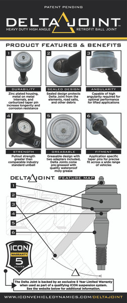 These upper control arms feature ICON's patented Delta Joint. The Delta Joint is a heavy duty high angle ball joint that combines the durability of a ball joint with the performance characteristics of a traditional uniball. While the industry standard uniball does a great job of allowing the control arms of a vehicle to articulate with little bind, they do have an inherent weakness that leaves more to be desired when used in a daily driven application - exposure to the elements. The Delta Joint features a zinc plated housing providing the first layer of corrosion resistance, while a tough grease seal keeps potentially harmful elements out of the inner workings of the joint. Metal on metal construction and a greasable design increase the longevity of the Delta Joint while at the same time allowing for noise-free operation. What makes the Delta Joint unique is that it brings the best of both worlds to ICON upper control arms with features that make it more robust than a uniball, and at the same time capable of greater angularity than a typical ball joint.