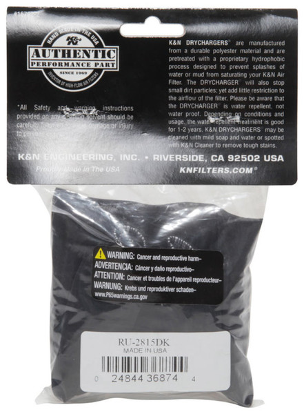 The K&N Drycharger is a silicone treated, polyester wrap that is made to cover K&N Air Filters or Personal Watercraft Flame Arrestors. These Drychargers, which are similar to the K&N Prechargers, contain uniform micron sized openings that allow high air flow. Yet, due to the Drychargers silicone treated polyester wrap, the amount of water that reaches the air filter or flame arrestor is limited.