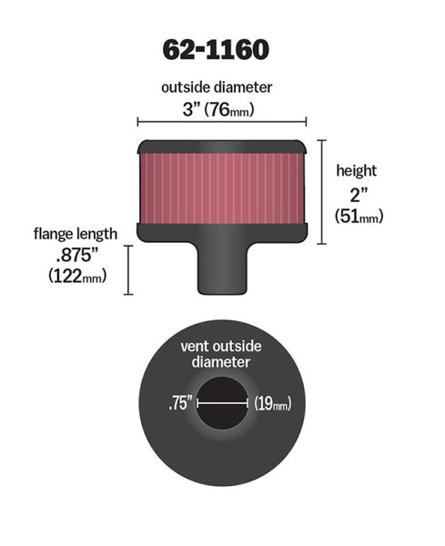K&N crankcase vent filters are perfect for racing applications, vintage cars or individuals who want to add some aesthetics to their classic carbureted engine. The 62-1160 crankcase vent filter has a K&N embossed chrome-plated steel top and chrome-plated steel base. The 3/4 inch diameter zinc tube is designed to push in and clamp directly on to metal or plastic tubing where venting is needed. Constructed with a non-woven synthetic filter media it can be cleaned and reused repeatedly. Note: Legal in California only for racing vehicles which may never be used, registered, or licensed for use upon a highway. See knfilters.com for CARB status on each part for a specific vehicle.