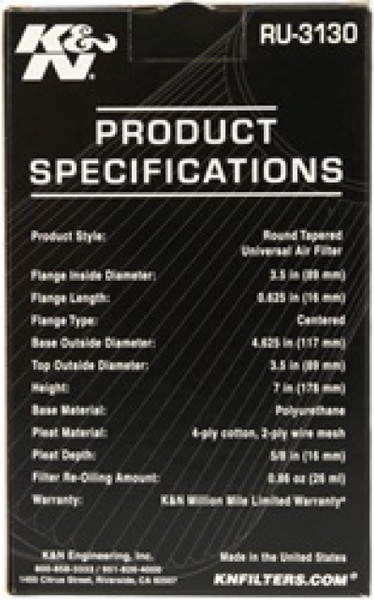 K&N Filter Universal Rubber Filter 3 1/2 inch Flange 4 5/8 inch Base 3 1/2 inch Top 7 inch Height - RU-3130