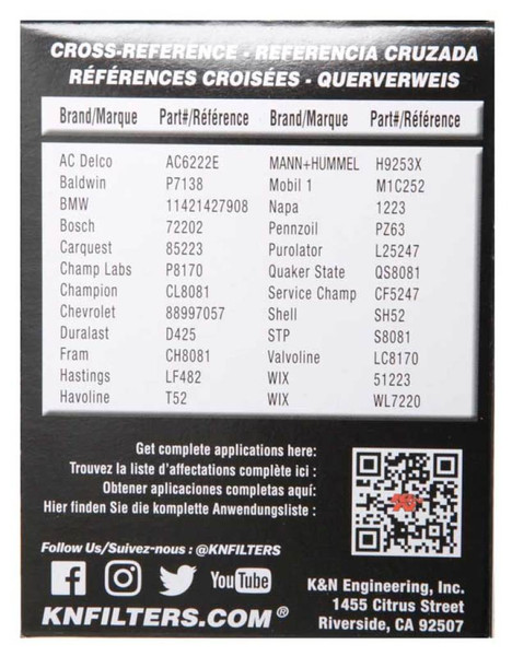 K&N Cartridge Oil Filters are designed to satisfy the needs of racers and engine builders as well as the average vehicle owner who wants the best oil filter available. K&N cartridge oil filters trap harmful contaminants while the filter's construction allows for high oil flow rates. All K&N oil filters are manufactured to meet stringent engineering standards. They are covered by a limited warranty to be free from defects in materials and workmanship when installed and replaced using engine and equipment manufacturer's recommended service intervals.