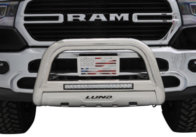 Whether the truck has aggressive lines or more refined curves, the LUND Revolution Bull Bar delivers extra front-end protection with its leading edge, chiseled three-dimensional design. LUND Revolution is constructed from heavy-gauge stamped steel with a light textured matte-black, powder coated finish. The rugged style features an integrated off-road LED light bar with a wiring kit, and installs with no drilling.