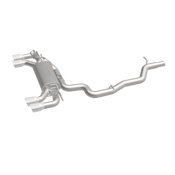 The MagnaFlow 2015-2017 Volkswagen Golf R Sport Series Cat-Back Performance Exhaust System 19165 enhances your 2.0L 2015-2017 Volkswagen Golf R with an aggressive character that is sure to help you stand out from the other Volkswagen Golf R you encounter on the street. With its 3in. diameter fast-flowing mandrel bent main piping that passes through 1 Straight-Through mufflers before ending in a Quad Split Rear exit with 3.5in. Polished Welded-On Double Wall Angle Cut Folded Edge tips, this dyno-proven Volkswagen Golf R exhaust system refuses to be ignored. As such, 19165 is tuned to produce our powerful, resonant signature exhaust note at Aggressive exterior and Moderate interior sound levels, so please check to ensure compliance with local noise regulations. The system's cat-back design replaces all your import's stock exhaust components from the catalytic converter on back. Extensive 3D scanning and CNC precision robotic manufacturing techniques are used to ensure that your exhaust system fits perfectly with just a simple do-it-yourself installation process. The durable, corrosion resistant stainless steel construction of 19165 is backed by MagnaFlow's limited lifetime warranty.
