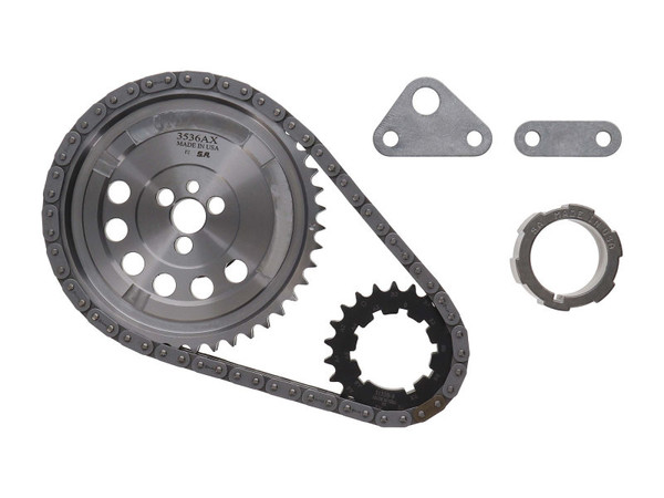 Fully machined billet steel camshaft and crankshaft sprocketsRoller chain designed with .250" diameter rollersNine keyway steel crankshaft sprocket enabling different settings: 0?, +/- 2?, +/- 4?, +/- 6?, +/- 8?Camshaft sprockets are machined for and include a captive Torrington thrust bearingNo grinding/modifying of timing cover requiredNOT recommended for valve spring pressures exceeding 450 lbs.