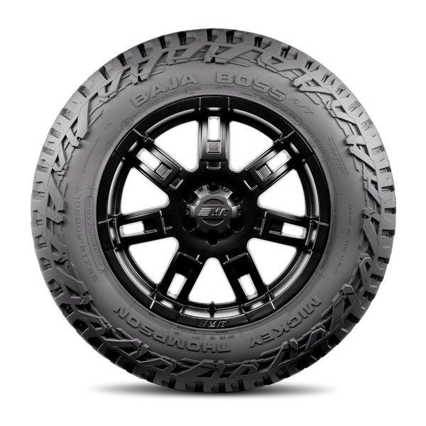 The Baja Boss A/T delivers premium on-road handling, performance, and tread wear while also dominating in the mud and snow thanks to its pioneering asymmetric tread design, silica-reinforced compound, extreme Sidebiters and revolutionary PowerPly XD 3-ply construction LT sizes only. Featuring a 50,000-mile treadwear warranty and 3PMS designation, it's Mickey Thompson's most innovative hybrid A/T to date - aggressive looks, low noise, long-lasting tread, and smooth ride. 3PMS Symbol certifies that all sizes 12.50 (315) and narrower are severe snow rated.