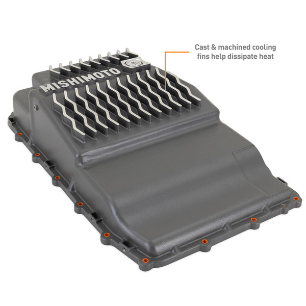 This Mishimoto Aluminum Transmission Pan is a direct-fit, high-performance upgrade for your Ford 10R60/10R80 transmission in your Bronco, Ranger, F-150, or Mustang. Cast from high-quality aluminum and powder coated Gunmetal Gray, our transmission pan is a robust and long-lasting upgrade for your vehicle's transmission. With a sleek design and bottom ribs, this pan not only adds to the overall aesthetic of your vehicle but also provides improved cooling performance.----This transmission pan features internal baffles that reduce sloshing and enhance heat dissipation, resulting in smoother transmission performance. All the headaches that come with a flat gasket and messy sealants are eliminated with our precision-machined dovetail-style groove and O-ring seal. This groove positively retains the O-ring, so you never have to worry about it falling out of place during installation. Additionally, the Mishimoto Ford 10R60/10R80 Aluminum Transmission Pan adds an extra 2 quarts of ATF to help maintain optimal transmission operation.----Fed up with the frustration of trying to hold up a transmission pan with one hand while threading the fasteners in with the other? Mishimoto has you covered with pre-installed bolt retainers that hold the fasteners in the pan, allowing you to easily thread the bolts without dropping them on the ground, your head, or worse, that pan of nasty transmission fluid you just drained. Additionally, our pan comes equipped with a magnetic drain plug for easy draining and a 1/8-inch NPT port and plug for temperature sensors to make servicing your transmission and monitoring temperatures a breeze.----This direct-fit upgrade offers affordable durability and helps maintain smooth transmission operation, ensuring a long life for your transmission. Like all Mishimoto products, this transmission pan is backed by the Mishimoto Lifetime Warranty.
