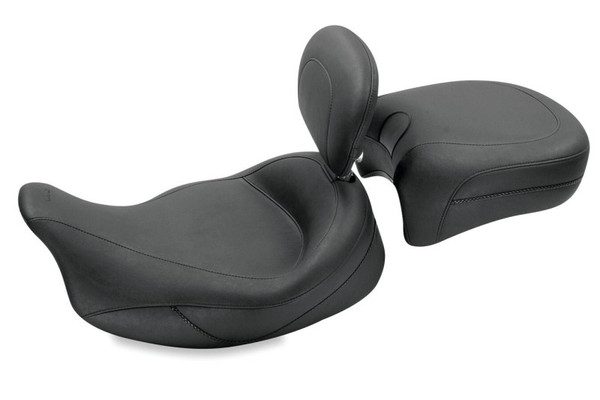 Mustang's "Super" comfortable 17" wide solo sits the driver 1.25" further back than the stock seat and is available with or without a fully adjustable and easily removable driver backrest. Pair with an 8.5" or 11" passenger seat, or a recessed 13.5" passenger seat for comfortable 2-up riding. Recessed passenger seats are required for use with the available built-in driver backrest, while regular passenger seats extend forward for additional rider back support on solos without the driver backrest. Choice of plain, chrome studs or black pearl-centered studs. Solo comes complete with chrome hardware (78032) and matching mini fender bib (78064).