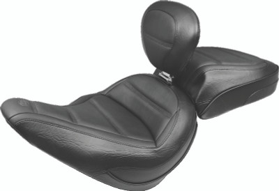 Mustang's standard touring solo offers a 14" wide driver seat with deep bucket styling for back support and to keep riders from sliding back. The 8" wide passenger seat extends forward slightly for increased driver back support. Both the original and studded styles are trimmed with a braided edge skirt. Available with or without a fully adjustable and easily removable driver backrest. Recessed Passenger seats are designed for use with the built-in driver backrest.