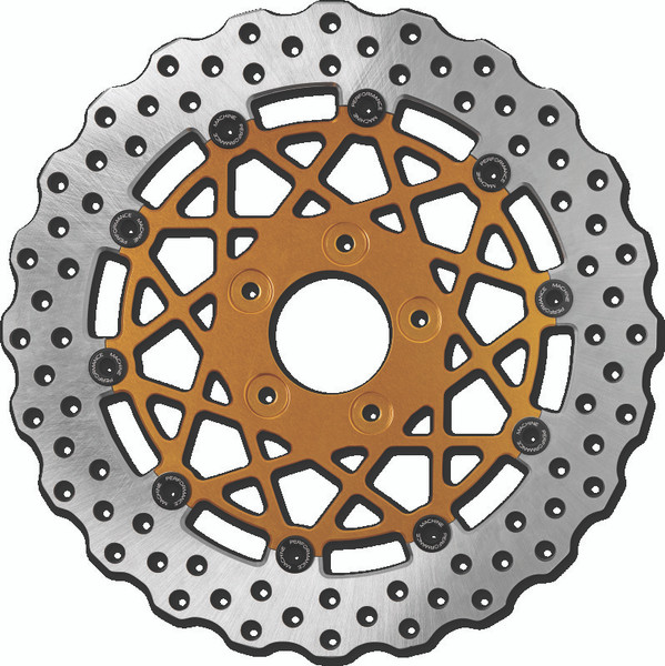 Performance Machine Speedstar Race Weight Full-Floating Brake Rotors are CNC precision machined to ensure a flat and parallel surface. Hardening the 420 stainless steel outer band to meet RC36 specifications, coupled with a full-floating design yields a rotor with a higher resistance to deformation. The wave cut braking surface is drilled in a sweep pattern for optimal heat dissipation with a reduction in weight. The inner carrier utilizes the increased strength of 7075-T6 aluminum for a lighter weight design while improving braking performance. The laser engraved PM logo on the floating elements will let everyone know you are serious about performance. Designed for use with most OEM and aftermarket wheels and calipers.