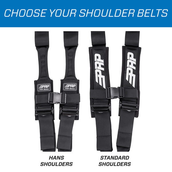 Whether racing, running the dunes, or crawling the Rubicon, the 5.3 Harness will hold you in tight. This 5 point harness with 3" belts has sewn in pads for comfort, all black hardware for style and EZ adjusters on the shoulders. The EZ adjusters allow you to adjust your shoulder straps quickly and even if they are dirty or muddy. The seat belt also has a removable sternum strap, and a red latch guard on the lap belt. The lap belt bolts in. The shoulder harness and crotch strap can either bolt down or wrap around a roll bar. SFI 16.1 certified for racing. Warning Proper installation and consistent use of the 5 point harness restraint system is critical to your safety in event of accident. To reduce risk of serious injury or death: Follow vehicle manufacturers, and PRP Seats instructions and safety messages during installation and use of this product. Use all belts provided. Secure lap belt first; low and snug across hips. Sternum strap tight at chest line (min. 4” below neck). Adjust remaining straps per instructions and confirm fitment restrains user & provides safe clearance from wheel, dash, roll cage, etc. Inspect all components of the 5 point harness restraint system regularly & replace as indicated by accident, wear or abrasion. Replace no later than 2 years from date on SFI 16.1 tag.  This 5 point competition restraint system is intended for UTV or other off-road vehicle-not replacement for FMVSS 209 restraints. Never use with child car seats or boosters.