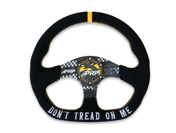 Revolutionize your ride with PRP's Limited Edition Dont Tread on Me D-Shaped Steering Wheel! Like all PRP Steering Wheels, these limited editions are Built for Off-Road. Constructed from high-strength aluminum, it can take the abuse of racing rock crawling or flying across the desert. Thew wheel featues a unique spoke design with Liberty or Death emblazoned on the side. The grips use high quality and durable black suede, with Dont Tread on Me embroidered on the bottom. The steering wheel has a 6-point bolt pattern, specifically chosen because it fits most aftermarket hubs and quick releases. Customize the look of your Dont Tread on Me Wheel by adding on one of PRP's Dont Tread on Me, Liberty or Death, or Snake-PRP Center Caps. Features: Made from high strength aluminum - tested at 500lbs to first deflection 6 Point Bolt Pattern - Most common in off-road industry quick release adapters. Durable and moisture resistant High-Quality Black Suede and Yellow Leather Grip Measurements: Diameter – 13 inches  Weight – 2 lbs Dish depth – 1½ inches Bolt Pattern Measurement - 2.75"
