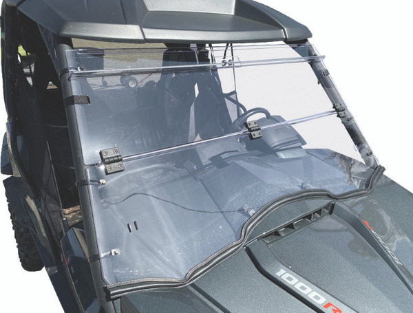 Folding windshield constructed from premium 0.177" thick, optically clear polycarbonate material that can be hinged up or down to increase or limit airflow in the cabin.