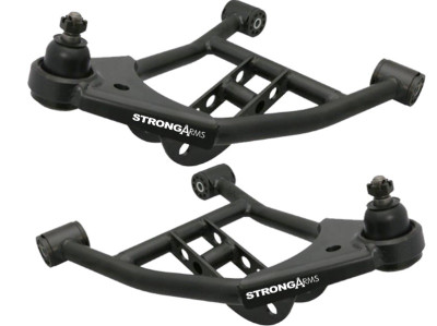 Rear lower StrongArms for 1964-1972 GM A-Body. Includes a pair of tubular lower trailing arms with R-Joints. Not compatible with stock style sway bar. Powder coated satin black.