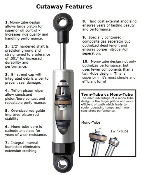 Rear HQ Shock Absorber with 6.65" stroke with wide stud/stud mounting. Includes 1 rebound adjustable shock. 10.05" x 16.7" with a 13"-14" ride height.
