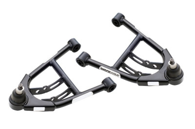 Front lower StrongArms for 1974-1978 Mustang II suspension. For use with CoolRide air springs. Includes a pair of tubular control arms with ball joints and delrin bushings. Powder coated satin black.