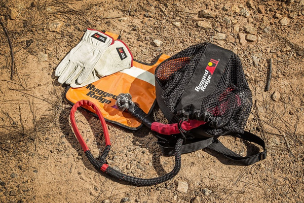 When you are preparing for your next off-road adventure, don't forget to pack the essentials needed for vehicle recovery. Rugged Ridge makes it simple to know that you have what you need for any scenario with our Premium Recovery Kit. Each kit includes a 30-foot kinetic recovery rope with a 7500 load limit that makes quick work of even the stickiest of situations, a 20,000 pound snatch block pulley, a 3- in. tree strap, a pair of 7/16- in. soft rope shackles, a high-visibility Winch line dampener and a pair of rugged leather work gloves- all packed in a lightweight mesh recovery gear bag. You can hit the trails with the confidence knowing that you're prepared for almost everything.