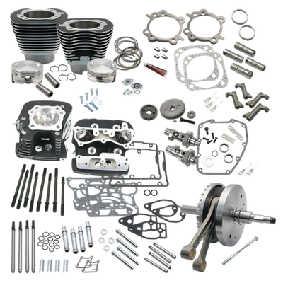 This 124" big bore/stroker Hot Set Up Kit® transforms a stock 88" engine into a 124" monster. This kit includes S&S 4-1/8" bore pistons, big bore cylinders finished in wrinkle black powder coat, a dynamically balanced 4-5/8" stroke three piece flywheel assembly complete with S&S heavy duty connecting rods and intergal mainshafts, S&S 640 gear drive Easy Start camshafts, S&S chromoly steel adjustable pushrods, S&S premium tappets,S&S Super Stock 91cc cylinder heads. When installed the kit yeilds a 124" engine with a compression ratio of 11:1. Although the engine is .960" taller than stock, there are no frame clearance problems, and a stock EFI Throttle body will fit because the manifold mounting surfaces of the heads have been specially machined to fit a stock length manifold. No fuel or ignition system is included. However, for the best results, a larger carburetor of EFI throttle body, performance intake and performance exhaust are recommended. The EFI system must be recalibrated.