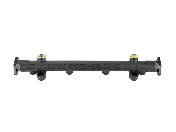 Skunk2's cutting-edge Composite Fuel Rail for the Evo VIII-IX is here. Skunk2's Composite Fuel Rails are made using a proprietary carbon-impregnated, aerospace thermo-polymer composite—a material that's 33-percent lighter, 60-percent stronger, and operates up to 100-degrees F cooler when compared to aluminum and insulates fuel from both radiant and conductive heat transfer underneath the hood, resulting in increased horsepower and torque. Composite Fuel Rails also feature large 0.625- in. internal bores for superior fuel injector pulsation dampening, are machined with a smooth interior finish, and feature radius-cut fuel injector outlets for improved flow characteristics. The special design that eliminates the sharp internal angles where the main bore meets the fuel injector bores inherent with conventional extruded- and drilled-aluminum designs can only be achieved with such composite materials. Skunk2's Evo Composite Fuel Rails are compatible with the factory fuel system, as well as all fuels, including alcohol, and can support up to 1,200 hp.
