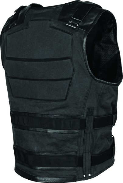 A savage show of force fueled outside of convention. This is our take on tactical street protection. The True Grit™ Armored Motorcycle Vest is built with a heavy-duty canvas frame that includes leather trim and high-density padding at the front and back torso. The vest comes fully equipped with a removable right-handed Armed Response™ open carry-side holster and a removable Vault™ spine protector.