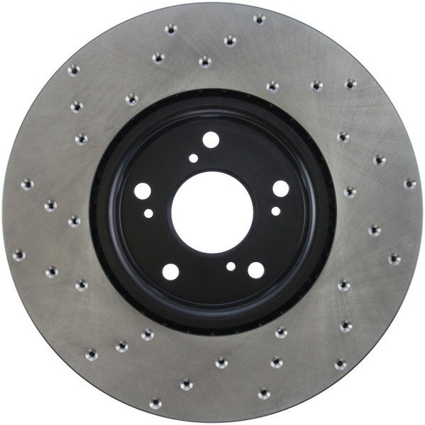 StopTech Drilled Sport Rotors are 1-piece direct replacement brake discs for factory brake systems and stock calipers that look great behind your wheels – and offer significantly improved braking performance. The unique cross-drilling aids with heat and brake dust dispersal; prevents glazing of the pads; adds bite and improves wet and dry braking performance. Built to last; the black e-coating provides protection from corrosion and the high carbon metallurgy (in most applications) offers quieter operation; better crack resistance and increased performance.