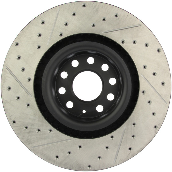 StopTech Drilled and Slotted Sport Rotors are 1-piece direct replacement brake discs for factory brake systems and stock calipers that look great behind your wheels – and offer significantly improved braking performance. The unique cross-drilling and slotting aids with heat and brake dust dispersal; prevents glazing of the pads; adds bite and improves wet and dry braking performance. Built to last; the black e-coating provides protection from corrosion and the high carbon metallurgy (in most applications) offers quieter operation; better crack resistance and increased performance.