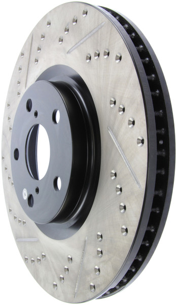 StopTech Drilled and Slotted Sport Rotors are 1-piece direct replacement brake discs for factory brake systems and stock calipers that look great behind your wheels – and offer significantly improved braking performance. The unique cross-drilling and slotting aids with heat and brake dust dispersal; prevents glazing of the pads; adds bite and improves wet and dry braking performance. Built to last; the black e-coating provides protection from corrosion and the high carbon metallurgy (in most applications) offers quieter operation; better crack resistance and increased performance.
