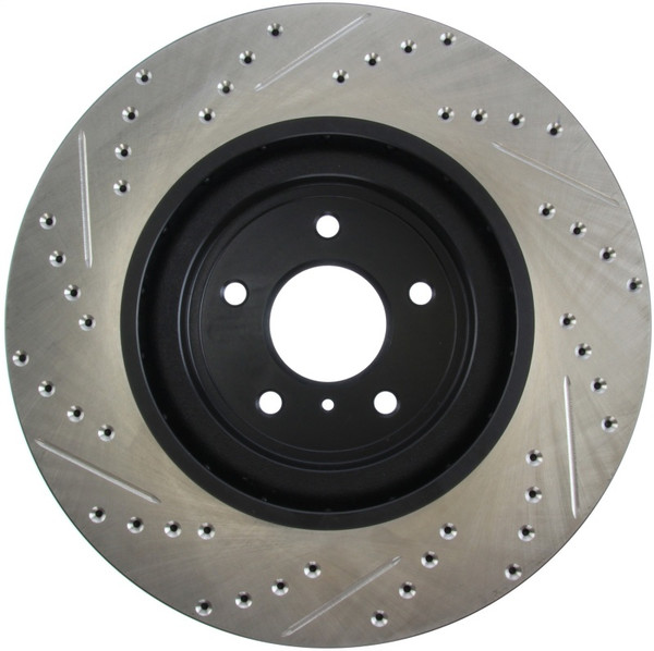 StopTech Drilled and Slotted Sport Rotors are 1-piece direct replacement brake discs for factory brake systems and stock calipers that look great behind your wheels – and offer significantly improved braking performance. The unique cross-drilling and slotting aids with heat and brake dust dispersal; prevents glazing of the pads; adds bite and improves wet and dry braking performance. Built to last; the black e-coating provides protection from corrosion and the high carbon metallurgy (in most applications) offers quieter operation; better crack resistance and increased performance.