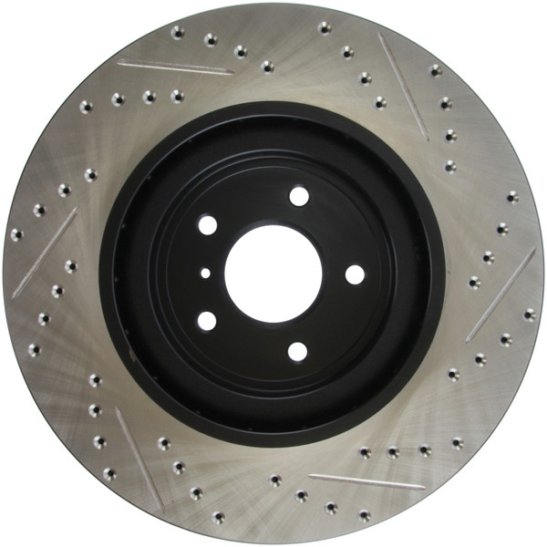 StopTech Drilled and Slotted Sport Rotors are 1-piece direct replacement brake discs for factory brake systems and stock calipers that look great behind your wheels – and offer significantly improved braking performance. The unique cross-drilling and slotting aids with heat and brake dust dispersal; prevents glazing of the pads; adds bite and improves wet and dry braking performance. Built to last; the black e-coating provides protection from corrosion and the high carbon metallurgy (in most applications) offers quieter operation; better crack resistance and increased performance.