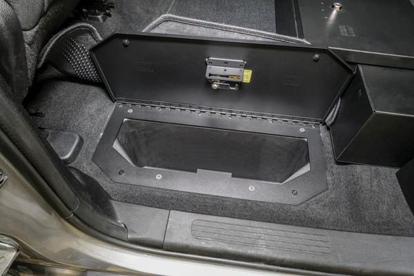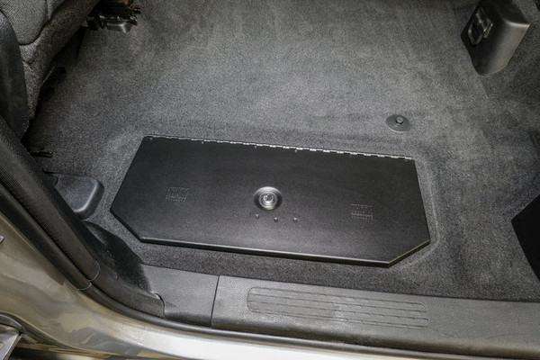 Sometimes you temporarily need to store your firearm in your truck, these heavy-duty locking Storage Lids replace the existing plastic OEM factory covers, creating secure storage in the hidden OEM compartments in the floor. The unique designs feature our Pry-Guard locking system with 1/8 inch thick steel components and a welded continuous steel hinge. The lids also provide a sturdier and more durable deck surface for items placed on top. Easy to install using standard hand tools in just a few minutes. Constructed from 16 gauge and 1/8 inch thick welded steel.