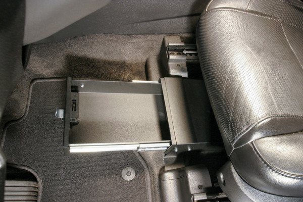 This high security 16 gauge steel security drawer mounts under the drivers or passengers side seat in a Ford Explorer (NOTE: does not fit Explorer Sport or ST models). The formfitting design of the Tuffy lockbox has over 200 cubic inches of lockable storage with no need to reroute under seat wiring harnesses. It's secured contents are easily accessed by maneuvering the drawer open and closed on the smooth ball bearing slides using the convenient pull lever. Featuring Tuffy's Pry-Guard Locking System with a 10 tumbler double bitted security lock with built in weather seals. The design incorporates a heavy duty fully extending slide system, weather seal and welded construction. A formed rib in the enclosure additionally strengthens the locking system. Tuffy's exclusive bolt-blocker bracket is included for additional security. Mounts inconspicuously under the seat out of apparent site of would be thieves.